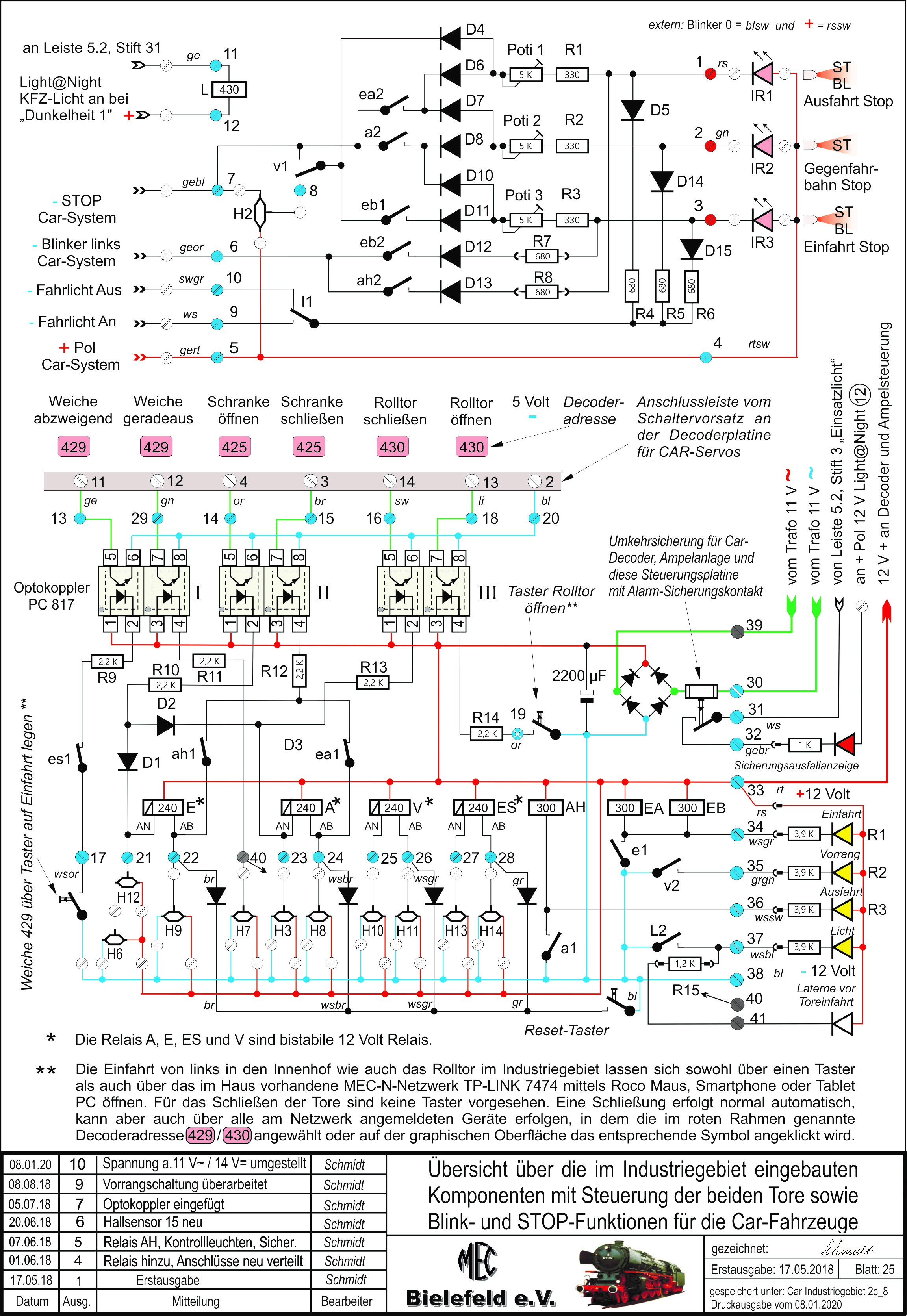 Bei dieser Steuerung wurde die Verriegelung der Fahrwege über Relais, Gatter, Hallsensoren und Infrarot Leuchtdioden vorgenommen. Die Verknüpfung und Erläuterung der verschiedenen Befehle mit den 14 Hallsensoren und Infrarot-Dioden können technisch Interressierte der nachfolgenden Zeichnung entnehmen. Damit alle Verknüpfungen einen störungsfreien Ablauf der Kommunikation zwischen Fahrzeugen, dem Ausgangstor und den Vorfahrtsregeln und der Steuerung ergeben, sind alle Kraftfahrzeuge mit einem CAR-Decoder ausgerüstet. Damit können alle Blink-, Front-, Brems- und Rücklichter aktiviert werden. Dieser gewährleistet mit den Infrarot-Dioden ebenso einen störungsfreien Ablauf durch die integrierte Abstandssteuerung zwischen den Fahrzeugen.